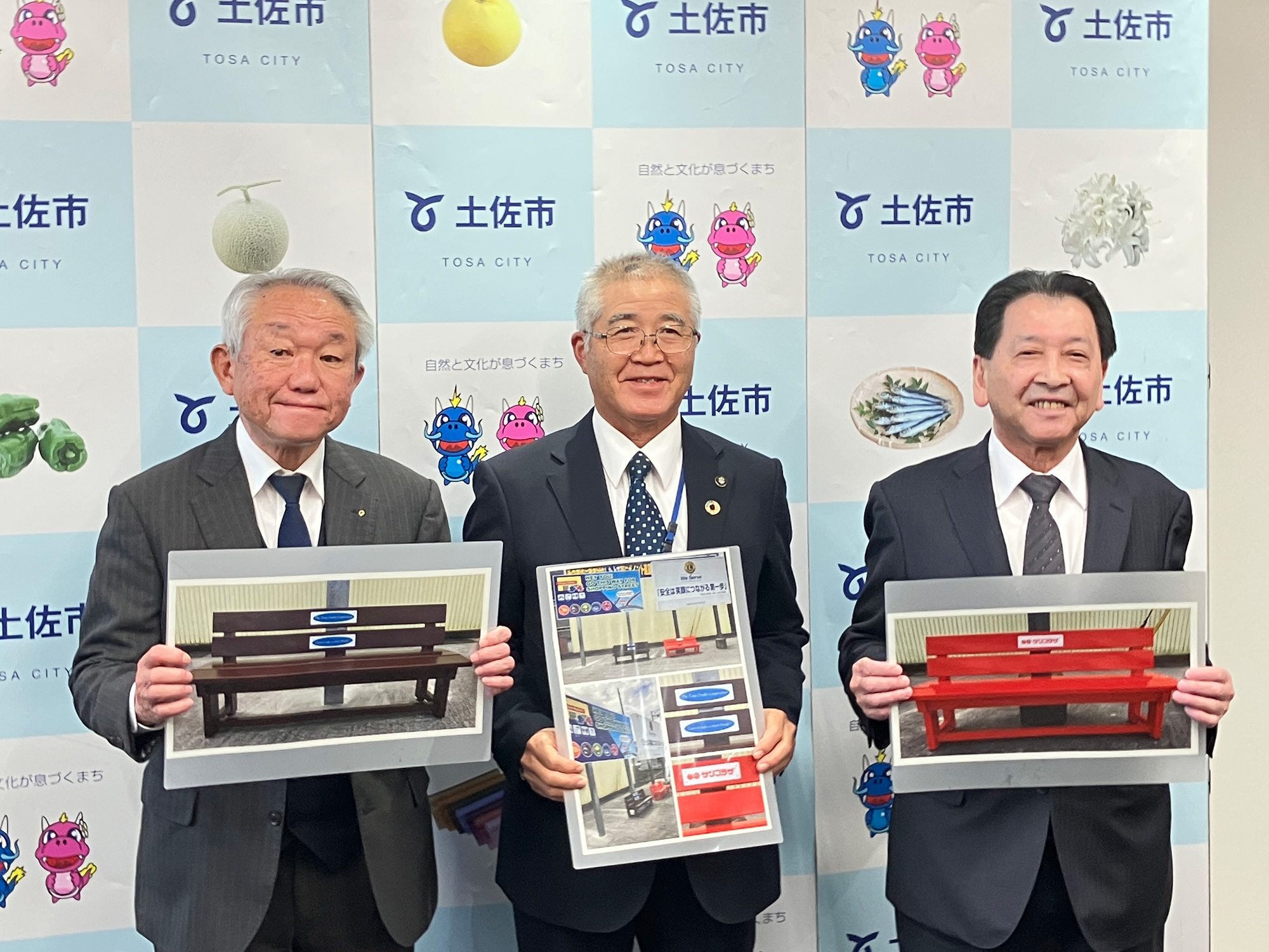 土佐市に3つ目の休憩ベンチを寄贈しました この度、土佐市街道沿いの休憩ベンチの寄贈式を執り行い、 今回で3か所目となるベンチを寄贈させていただきました。 新たに設置した場所は、土佐市高岡町のヤマダデンキ様北側のバイパス沿いです。 市民の皆様の散策やバスを待つ間の休憩場所として、お役に立てれば幸いです。 これまでにも、市役所前バス停とつなーで前バス停にベンチを寄贈させていただきました。 今後も、土佐市の皆様が憩いのひとときを過ごせるよう、 微力ながら応援していきたいと考えております。